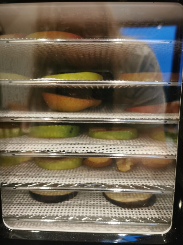 But in between the laundry and the cats…I decided to try the dehydrator on the obigine in residence. That took up one shelf, so I cored and sliced many apples and a single pear. I set the dehydrator to 60° for eight hours.